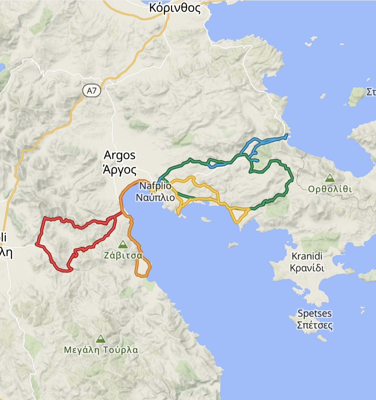 A rewarding loop from Nafplio to Kiveri and Astros following quiet coastal and countryside roads with gentle climbs before returning to Nafplio.